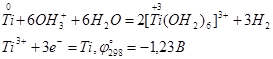Растворы титана. В водных растворах Ti находится преимущественно в 4-валентном состоянии, но в определенных условиях существуют комплексы, в которых валентность титана равна трем. Малый ионный радиус позволяет ему приобретать заметную долю электронной плотности кислородного донора с образованием прочной ковалентной связи. Значения электроотрицательности для TiOH и TiO – 2,43 и 2,56 соответственно. Сродство ионов Ti+4 настолько велико, что комплексы практически всегда содержат кислород и образуют в растворах титана(IV) цепи с гидроксильными и кислородными мостиками.