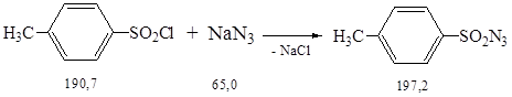 К раствору 95,2 г (0,50 моль) п-толуолсульфонилхлорида (предварительно перекристаллизованного из эфира) в 150 мл ацетона прикапывали при перемешивании раствор 35,7 г (0,55 моль) азида натрия в 100 мл воды и следили, чтобы температура реакционной смеси не поднималась выше 25 0С. Через 1,5 ч добавили еще 1 л воды и отделили органическую фазу на делительной воронке. Затем органическую фазу смешали с 250 мл воды и выделившийся тозилазид промыли водой (3 * 100 мл) и высушили над Na2SO4. При отсасывании получили маслянистый п-тозилазид с Тпл. = 5 0С, который затем полностью закристаллизовали. Выход твердого п-тозилазида составил 81 г (82 %).