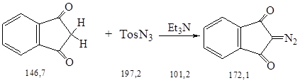 Суспензию 10,0 г (0,07 моль) тонкоизмельченного, охлажденного до –12 0С индандиона-1,3 в 60 мл безводного этанола прибавили при перемешивании к 9,0 г (0,09 моль) безводного триэтиламина; при этом температура поднимается до 4 0С. После повторного охлаждения к красно-коричневому раствору прилили 20,2 г (0,10 моль) п-тозилазида и смесь перемешали при охлаждении еще 1 ч.