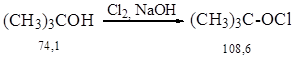 В двухгорлую круглодонную колбу объемом 250 мл поместили 100 мл NaOH (10 %) и прикапывали при перемешивании и охлаждении 7,4 г трет-бутанола. Затем смесь хлорировали около 30 мин., контролируя температуру, которая не должна подниматься выше 100С. Образовавшееся желтое масло отделили на делительной воронке и промыли холодной водой. Получили 5 г (46%) продукта с Ткип. = 77–78 0С.