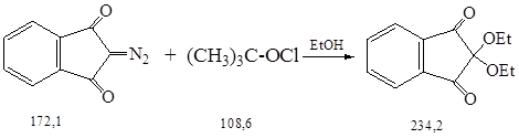 К суспензии 7,0 г (0,04 моль) тонкоизмельченного 2-диазоиндандиона-1,3 (см. п. 3.3.) в 60 мл этанола прикапали при перемешивании и охлаждении льдом 4,7 г (0,04 моль) трет-бутилгипохлорита (см. п. 3.4.) с такой скоростью, чтобы температура реакционной смеси не превышала 15 0С.