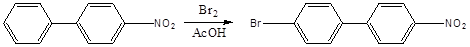 В работе [2] авторы получали 4-бром-4’-нитробифенил при перемешивании смеси при нагревании 4-нитробифенила в растворе ледяной уксусной кислоты с бромом в отсутствие катализатора, причем продолжительное нагревание уменьшало выход (выход 80%).