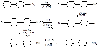4-нитробифенил получали по описанной в работе [1] методике. 4-Бром-4’-нитробифенил получали нагреванием смеси 4-нитробифенила, ледяной уксусной кислоты и брома, охлаждали и фильтровали осадок 4-бром-4’-нитробифенила, затем, его перекристаллизовывали из ледяной уксусной кислоты. 4-амино-4’-бромбифенил получали восстановлением 4-бром-4’-нитробифенила порошкообразным железом с соляной кислотой в этиловом спирте. Затем полученный амин диазотировали нитритом натрия с соляной кислотой при 00 и получали хлорид диазония, который затем превращали в тетрафторборат. Тетрафторборат 4-бромбифенил-4’-диазония нагревали с трифторуксусной кислотой и получали 4-бром-4’-гидроксибифенил, который кипятили в диметилформамиде с цианидом меди (1).
