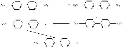 4-амино-4’-нитробифенил получали добавлением гидрата сульфида натрия и серы к кипящему спиртовому раствору 4,4’-динитробифенила. Полученный 4-амино-4’-нитробифенил отделяют, перекристаллизовывают из ацетона, а затем диазотируют в ледяной уксусной кислоте нитритомнатрия при 100. Раствор соли диазония разлагают с йодидом калия при нагревании на водяной бане. Затем полученный 4-йод-4’-нитробифенил восстанавливали при кипячении в растворе этанола с концентрированной соляной кислотой добавлением маленькими порциями порошкообразного цинка. Полученный продукт экстрагировали эфиром, затем перекристаллизовывали петролейным эфиром. Получили 4-амино-4’-йодбифенил т. пл. 1650[6].