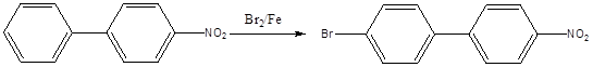 К 19,9 г(0,1 моль) 4-нитробифенила прибавили 60мл хлороформа, 6,5мл (20,2 г; 0,13моль) брома и 0,73г порошкообразного железа, Полученную смесь осторожно нагрели до начала бурной реакции , затем, кипятили в течение 2ч. Добавили еще 0,25г железа и кипятили еще 1ч. Реакционную смесь охладили до комнатной температуры, прибавили к ней водный раствор сульфита натрия (10г Na2SO3 в 50мл воды) и перемешивали полученную смесь для удаления избытка брома. Осадок продукта, окрашенного примесями в серо-коричневый цвет, отфильтровали, промыли водой и высушили на воздухе. Дополнительную порцию продукта получили после упаривания хлороформного раствора и перекристаллизации остатка из уксусной кислоты с добавлением активированного угля. Обе порции объединили и поместили в патрон аппарата Сокслета. Продукт экстрагировали петролейным эфиром(70/100о). Экстракцию продолжали до тех пор, пока петролейный эфир не начал окрашиваться в оранжевый цвет. Получили 4-бром-4’-нитробифенил в виде желтоватых кристаллов, т.пл -174-176о. Масса продукта составила 15,34г (выход 61%). Лит.данные [2]: т.пл. 173-176о