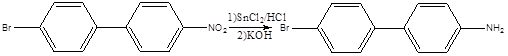 К 15,02г (0,054моль) 4-бром-4’-нитробифенила в 120мл спирта прибавили раствор 54г (0,24моль) дигидрата хлорида олова(II) в 60мл концентрированной соляной кислоты. Смесь нагревали 2ч на кипящей водяной бане при перемешивании. Затем раствор охладили, разбавили трехкратным объемом воды. Образовавшийся осадок соли амина отфильтровали, к нему прибавили раствор 50г KOH в 70мл воды. Смесь перемешивали в течение двух часов, затем добавили 100мл воды и отфильтровали осадок амина. Осадок промыли водой до нейтральной реакции и высушили на воздухе. Масса 4-бром-4’-аминобифенила составила 12,24г (выход 91%), т.пл. – 145-1470. Лит.данные [3]: т.пл. 143-145о