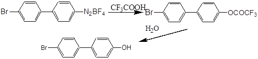 Получающийся вначале трифторацетат фенола легко гидролизуется при действии воды с образованием конечного продукта. В нашем эксперименте мы получили загрязненное вещество, что потребовало дополнительной кристаллизации из этанола. Поэтому выход чистого 4-бром-4’-гидроксибифенила после перекристаллизации составил только 57% (лит. данные [3]: выход 80%).