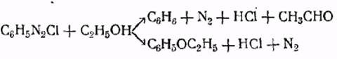 Один из наиболее ранних способов, примененных для замещения диазогруппы водородом, состоит в кипячении диазониевой соли со спиртом. Впоследствии было установлено, что при этом образуются также в большем или меньшем количестве жирноароматические эфиры. При нагревании сернокислого фенилдиазония с метиловым спиртом образуется анизол с 70%-ным выходом, наряду с небольшим количеством бензола. Следовательно, взаимодействие солей диазония со спиртами может протекать в двух направлениях.