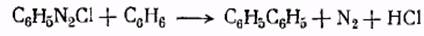 Дифенил и его производные можно также получить прибавлением сухого хлористого арилдиазония к ароматическому углеводороду, например бензолу или нафталину, смешанному с некоторый количеством безводного хлористого алюминия. Таким образом при взаимодействии хлористого фенилдиазония с бензолом образуется дифенил, а с нафталином — смесь а- и р-фенилнафталинов. Этот способ был использован также для получения фенилпиридина и фенилхинолина, причем в этих случаях отпадала необходимость прибавления хлористого алюминия