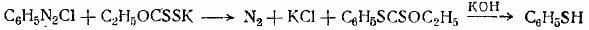 Замещение диазониевой группы группой — АsО3Н2 обычно осуществляется действием мышьяковистокислого натрия в щелочном растворе на соли диазония Получение тиофенолов, ароматических сульфидов и дисульфидов из солей диазония. Общий способ получения тиофенолов из солей диазония был предложен Лейкартом. Способ состоит в смешивании охлажденных льдом растворов хлористого диазония с ксантогеновокислым калием в эквимолекулярном соотношении. При последующем нагревании образуется эфир этилксантогеновой кислоты, из которого при омылении спиртовой щелочью выделяется тиофенол.