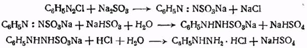 Более удобным является другой общий способ получения ароматических гидразинов, состоящий в восстановлении соответственного диазосульфоната бисульфитом или сернистым газом и в последующем гидролизе образовавшейся гидразинсульфоновой кислоты.