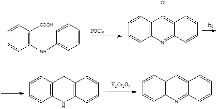 Акридин содержится в небольшом количестве в каменноугольной смоле. Его получают из 2-анилинобензойной кислоты: