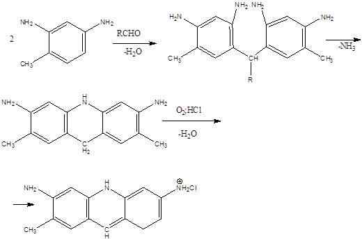 Акридиновый желтый получаеться таким же способом из м-толуилендиамина и формальдегида.[3]