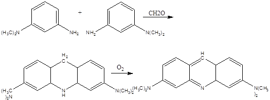 Акридиновый оранжевый. Исходными веществами для его синтеза служат нессим-диметиловый м-фенилендиамин и формальдегид, которые при нагревании конденсируются с образованием производного гидроакридина, окисляющегося кислородом воздуха в краситель: (уравнение3)