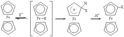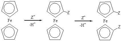 Поэтому замещение водорода в ферроцене при действии электрофильных реагентов происходит в более мягких условиях, нежели в бензоле.