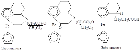 Существенной особенностью предложенного механизма является подход электрофила к пятичленному кольцу со стороны атома железа. Исследование внутримолекулярного ацилирования эпимерной пары кислот, в которых из-за их пространственного строения затруднены в первом случае эндо-, а во втором – экзо-циклическая электрофильная атака, показало, что обе кислоты под действием ангидрида трифторуксусной кислоты циклизуются в гомоциклический кетон, причём скорость циклизации экзо-кислоты несколько больше, чем скорость циклизации эндо-кислоты [7].