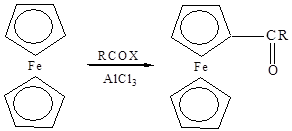 Ацилирование циклопентадиенилжелеза и его производных осуществлено многими реагентами. Первый ацил был синтезирован при взаимодействии ферроцена с ацетилхлоридом в присутствии хлористого алюминия [10]. Эта реакция дала толчок для изучения ароматических свойств данной системы, а также дала ферроцену его название.