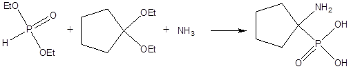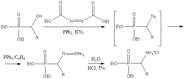 Введение аминогруппы может быть произведено при помощи нуклеофильного замещения [4]. В реакцию аминирования под действием аммиака., например, вступают α-галогенофосфоновые кислоты. Вместо аммиака также вводят азидную группу, воостанавливая ее гидрированием на Pd/C или трифенилфосфином. Также используют аналогичный спирт вместо галогенпроизводных: