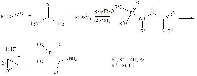 Вместо триалкилфосфитов в этой реакции можно применять трисилоксифосфиты. Это дает возможность проводить омыление полученного эфира α-аминофосфониевой кислоты с высокими выходами и в мягких условиях даже при комнатной температуре. Для этого используют, например, метанол (получается кислота) или рассчитанные количества метилата натрия в метаноле (образуется моно- или дизамещенная соль) [5].