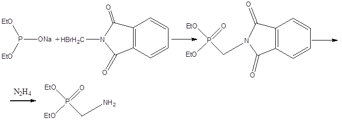 Впервые α-аминофосфонат, а именно аналог глицина, был получен по реакции Михаэлиса-Беккера (аналог синтеза первичных аминов по Габриэлю)[4]: