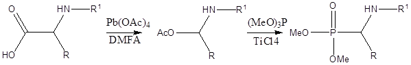 Важным методом получения α-аминофосфоната также является замена ацетатного остатка природных аминокислот на фосфонатную группу при помощи триметилфосфита. Реакция проводтся в две стадии: образованию связи C-P предшествует расщепление аминокислоты тетраацетатом свинца[4]: