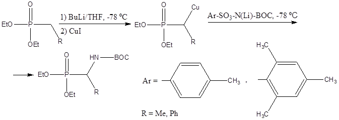 Электрофильное аминирование может быть произведено, если на α-атоме углерода будет создан большой избыток электронной плотности. Генерация карбанионов проводится при помощи обработки бутиллитием фосфонового эфира с алкильным или арильным заместителем в α-положении. Литиевую соль переводят в купрат и обрабатывают литиевым производным трет-бутил-N-тозилкарбамата, аллил-N-тозилкарбамата или аллил-N-мезоксикарбамата[4]: