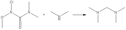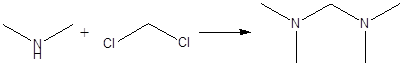 Ещё один синтез бис-(диметиламино)-метана из диметиламина был описан в работе [9]. Для получения этого вещества раствор диметиламина в дихлорметане нагревают до в водяной бане. После трёх часов реакции жидкую фазу выпаривают и далее разделяют при помощи фракционной перегонки.