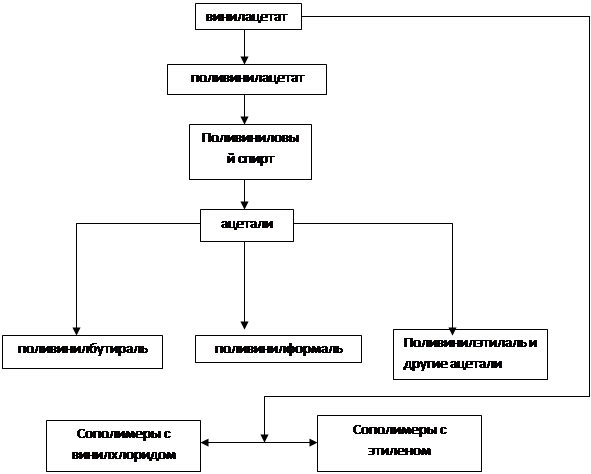 Среди полимерных продуктов, получаемых из винилацетата, наиболее широкое применение нашли поливинилацетат, поливиниловый спирт и поливинилацетали. Причем поливинилацетат благодаря высоким адгезионным свойствам и эластичности обладает высокой клеящей способности и применяется для производства водорастворимых латексных красок, клеев, для аппретирования тканей и т.д. Кроме того, широко распространены его сополимеры с винилхлоридом (винилит), этиленом, эфирами акриловой кислоты, стиролом и др.