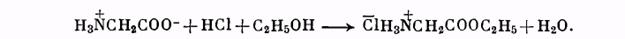 В результате этерификации в этих условиях эфиры также получаются в виде солей. Например, из аминоуксусной кислоты (гликоколя) и абсолютного этилового спирта образуется хлористоводородная соль эфира гликоколя