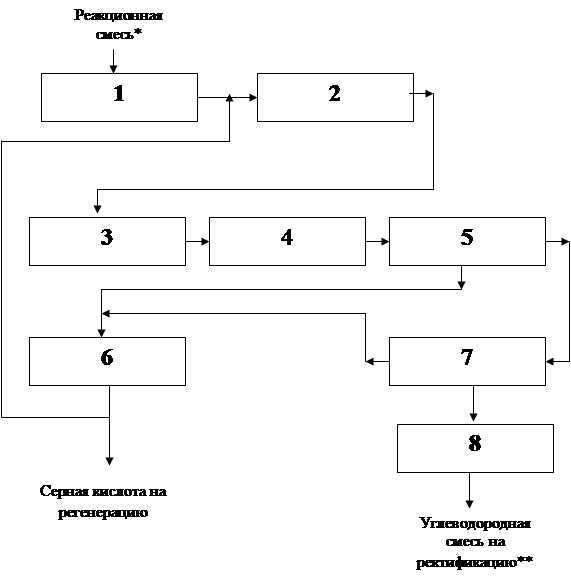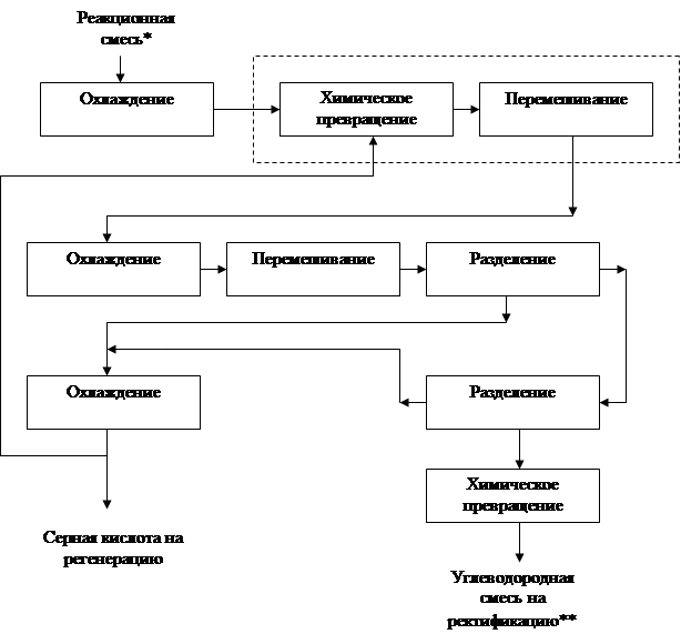 Смесь из реактора поступает в холодильник, где охлаждается до начальной температуры t2 после чего часть ее, соответствующая количеству гидроперекиси, поданной на разложение, выводится из системы, а оставшаяся часть возвращается на циркуляцию. Как уже говорилось, в качестве реакционной среды может быть использована либо разбавленная серная кислота, легко отстаивающаяся от продуктов разложения гидроперекиси и возвращаемая в производственный цикл, либо собственно смесь продуктов разложения гидроперекиси.