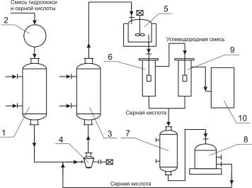 Гидроперекись изопропилбензола из сборника 2 подают через холодильник 1 в реактор, представляющий собой центробежный насос 4, в котором смесь дополнительно перемешивается путем применения ультразвука. Смесь из насоса 4 поступает в холодильник 3, где отводится тепло реакции. Охлажденная смесь поступает в сосуд 5, снабженный мешалкой и охлаждающим устройством. После дополнительного перемешивания и охлаждения в сосуде 5 смесь направляют в первый разделитель 6, откуда отделившаяся серная кислота стекает через холодильник 7 в сборник 8. Углеводородный слой из сосуда 6 поступает во второй разделитель 9 для окончательного отделения остатков серной кислоты. Свободный от кислоты углеводородный слой подают из сосуда 9 в нейтрализатор 10, а оттуда — на ректификацию для выделения целевых продуктов.