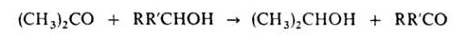 Ацетон (от латинского acetum - уксус) (2-пропанон, диметилкетон) СН3СОСН3, мол. м. 58,079; летучая бесцветная жидкость с характерным запахом; Тпл. - 94,6°С, Ткип. 56,1 °С; d420 0,7920, nD20 1,3588; η 0,36 мПа×с (10°С), 0,30 мПа×с (30 С); γ 0,0237 Н/м (20°С); tкрит 235,5°С, pкрит 4,75 МПа; С°р 749,3 Дж/(кмоль×К); ΔH°исп 29,1 кДж/моль (56,1 °С), ΔН°сгор -1787кДж/моль, ΔН°обр - 216,5 кДж/моль (газ; 25°С) и - 248 кДж/моль (жидкость). Смешивается с водой и органическими растворителями, например эфиром, метанолом, этанолом, сложными эфирами. Ацетон обладает всеми химическими свойствами, характерными для алифатических кетонов. Образует кристаллические соединения с гидросульфитами щелочных металлов, напр. с NaHSO3 - (CH3)2C(OH)SO3Na. Только сильные окислители, например щелочной раствор КМnО4 и хромовая кислота, окисляют ацетон до уксусной и муравьиной кислот и далее - до СО2 и воды. Каталитически восстанавливается до изопропанола, амальгамами Mg или Zn, а также Zn с СН3СООН - до пинакона (СН3)2С(ОН)С(ОН)(СН3)2. Атомы водорода легко замещаются при галогенировании, нитрозировании и т.п. Действием хлора и щелочи ацетон превращается в хлороформ, который взаимодействуя с ацетоном с образованием хлорэтона (СН3)2С(ОН)СС13, применяемого как антисептик. Ацетон окисляет вторичные спирты в присутствии алкоголятов А1 до кетонов (реакция Оппенауэра):