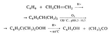 Вступает в альдольную конденсацию с образованием диацетонового спирта (СН3)2С(ОН)СН2СОСН3, а также в кротоновую конденсацию с образованием окиси мезитила (СН3)2С=СНСОСН3, форона (СН3)2С=СНСОСН=С(СН3)2 и мезитилена. В присутствии сильной минеральной кислоты ацетон алкилирует фенол с образованием дифенилолпропана (бисфенола ацетона) (НОС6Н4)2С(СН3)2, присоединяет цианид-ион с образованием ацетонциангидрина (CH3)2C(OH)CN. При пиролизе (700°С) ацетон образуются кетен СН2=С=О и метан. В промышленсти ацетон получают преимущественно так назеваемым кумольным способом одновременно с фенолом из бензола и пропилена через изопропилбензол (кумол) по схеме, рассмотренной подробнее выше: