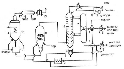 Дизельное топливо и тяжелая фракция проходят через секции отпарной колонны 7, охлаждаются в теплообменниках 1 и холодильниках 8 и отводятся как товарные продукты. Часть тяжелой фракции в виде рециркулята смешивается с сырьем и подается в реактор 3, а часть направляется на орошение нижней части колонны 4. Смесь тяжелых жидких продуктов крекинга и катализаторной пыли из низа колонны 4 поступает в шламоотделитель 9, из которого шлам возвращается в реактор 3, а богатый ароматическими углеводородами декантат отводится с установки.