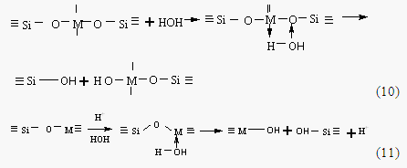 Более высокая полярность связи O-M в группировках Si-O-M по сравнению с группой Si-O-Si в изоструктурных силоксанах обуславливает повышенную склонность гетеросилоксанов к гетеролитическим (ионным) реакциям, в частности, гидролизу. Когда электроотрицательность кремния и металла резко отличаются, гетеросилоксановая группировка Si-O-Mn гидролитически неустойчива. При действии воды она может либо обратимо диссоциировать на ионы Si-O- и M+ (при n=1 и M – щелочной металл), либо обратимо или необратимо гидролизоваться с первичным образованием фрагментов SiOH HOMn . По мнению авторов [44] механизм гидролиза связи M-O-Si заключается в образовании координационного переходного комплекса между молекулой воды и молекулой гидролизуемого вещества с последующим распадом по схемам: