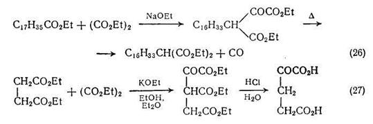 Реакция Михаэля используется для получения различных ди- и поликарбоновых кислот. В этом разделе мы рассмотрим несколько типичных примеров этой реакции. Малонат-анион присоединяется к сложным эфирам и нитрилам α,β-ненасыщенных кислот с образованием продуктов, дающих при гидролизе производные глутаровой кислоты {схемы (33)—(36)}.