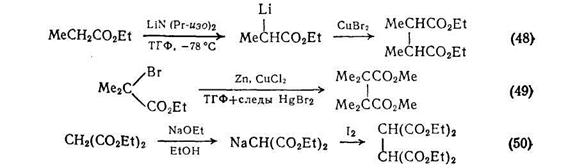 В синтезе дикарбоновых кислот этим путем можно выделить два окислительных процесса: первый включает окислительную димеризацию, второй — расщепление углерод-углеродной связи, часто в циклических соединениях {схема (47)}. Сложные эфиры янтарной кислоты можно получать окислительной димеризацией енолят-анионов в присутствии солей меди (II). Метод, использующий литиевые еноляты, {схема (48)} проще и, по-видимому, носит более общий характер, чем альтернативная методика с применением цинкорганических соединений {схема (49)}. Обе реакции напоминают давно известные методы димеризации стабильных анионов, например анионов диэтилмалоната с использованием йода в качестве окислителя {схема (50)}.