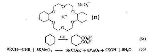 Использование краун-эфиров позволяет снять большинство проблем [50], ибо эти соединения способны образовывать комплексы с солями металлов, что приводит к повышению растворимости в органической среде и повышению реакционной способности анионов. Например, дпцн;слогексил-18-краун-6 образует с перманганатом калия растворимый в бензоле комплекс (17), что дает прекрасный окислитель для органических субстратов. В частности, циклогексен окисляется им с количественным выходом до адипиновой кислоты {схема (54)}. По-видимому, нет оснований предполагать, что механизм этого окисления отличается до такового, действующего в водных средах {схемы (55), (56)}.