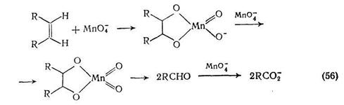 Пля окисления алкенов водным перманганатом калия можно v^nexOM спользовать катализ фазового переноса [51]. Реакции ^Готпатов растворенных в органической фазе, с неорганическими прягентами в водной фазе, которые ингибируются в силу раздела ГД часто катализируются добавлением следовых количеств рас-твпоимых в органической фазе тетраалкиламмониевых или тетра-аакиафосфониевых солей. Предполагают, что катализ осуществляется за счет способности катионов, растворимых в органическом растворителе, многократно переносить анионы в органическую фазу в форме, подходящей для реакции. Этот эффект носит название катализа фазового переноса.
