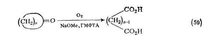 До дикарбоновых кислот можно окислить и другие карбоцикли-ческие соединения. В подходящем растворителе циклические ке-тоны [53] окисляются молекулярным кислородом до дикарбоновых кислот {схема (59)}. Показано, что многие растворители автоокис-ляются в условиях реакции, однако применение гексаметапола (ГМФТА) сводит эти побочные реакции до минимума и позволяет получать удовлетворительные выходы продуктов. Как правило, окисляется наиболее кислая связь С—Н кетона с образованием нестабильного промежуточного перокси-аниона. Полное окисление, аналогичное схеме (59), достигнуто действием азотной кислоты [54J.