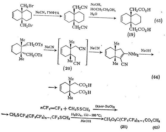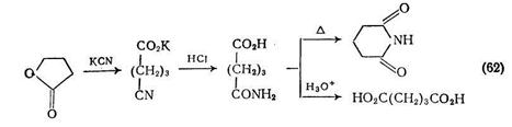 Удобный метод получения глутаровой кислоты [58] основан на гидролизе нитрилов: у-бутиролактон реагирует с цианидом калия при 190 °С, и калиевая соль получающейся цианокислоты гидро-лизуется до глутаровой кислоты. В тщательно контролируемых условиях гидролиза можно выделить моноамид глутаровой кислоты, который затем циклизуется в глутарамид {схема (62)}. Гидролиз динитрилов, получаемых из дигалогенидов, приводит к дикарбоновым кислотам. Дикарбоновая кислота (19), необходимая в качестве интермедиата для синтеза производного пропел-лана [59], была получена именно таким путем {схема (63)}. Подобные реакции замещения цианид-ионом не всегда протекают столь гладко, и как показано на схеме (64), в процессе реакции-замещения промежуточный динитрил (20) циклизуется в енамино-нитрил. Тем не менее гидролиз и размыкание цикла все же приводят к искомой кислоте [59-].