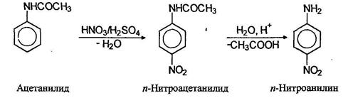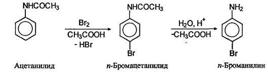 Ацетамидогруппа -NHCOCH3 также является ориентантом первого рода, хотя и более слабым, чем аминогруппы. Один атом галогена можно ввести, если аминогруппу предварительно проацилировать, а затем снять ацильную группу гидролизом: