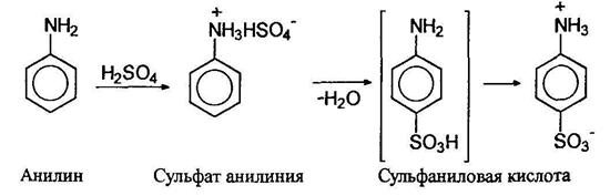 При сульфировании анилина концентрированной серной кислотой сначала образуется сульфат анилиния, при нагревании которого до 180-200°С образуется л-изомер анилинсульфокислоты (основной продукт), называемой сульфаниловой кислотой: