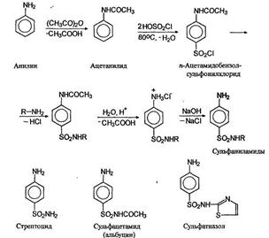 Молекула сульфаниловой кислоты включает и основание, и кислоту, и поэтому она существует в виде диполярного иона (цвиттериона). Сульфаниловая кислота имеет большое значение как элемент структуры сульфамидных препаратов, являющихся производными амида сульфаниловой кислоты (сульфаниламида). Их получают по схеме: