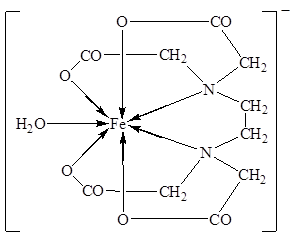 Комплекс железа с ЭДТА ([Fe(ЭДТА)(H2O)]-) относится к числу низкоспиновых[14]. В нем лиганд ЭДТА4-, как обычно, гексадентантен. Однако, КЧ иона Fe3+ равно 7, поскольку, кроме четырех атомов кислорода и двух атомов азота, ЭДТА4- во внутреннюю сферу КС входит атом кислорода внутрисферной гидратной воды: