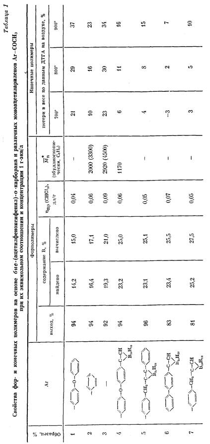 В ИК-спектрах полимеров присутствуют полосы в области 800—900, 1500 и 1600 см-1, характеризующие бензольные кольца и полосы при 2600 см-1, относящиеся к карборановым ядрам. Неожиданным оказалось то, что в спектрах полимеров на основе АФОК относительная интенсивность полосы при 1680 см _1, характеризующей концевые ацетильные группы, значительно ниже, чем у полимеров на основе диацетил-ароматических соединений без карборановых ядер, что свидетельствует о незначительном количестве этих групп.