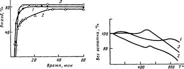 Рис. 1. Зависимость выхода спиртонерастворимой части полимеров на основе АФОК и 4-ацетилфеноксифенил-о-карборана (1), этилкеталей АФОК и 4-ацецетифенокси-фенил-о-карборана (2), АФОК и ацетофенона (3) от продолжительности синтеза
