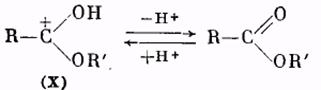 Далее катион (IX) отщепляет молекулу воды, превращаясь в катион сложного эфира (X):