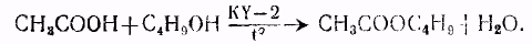 1. При расчете количество катионита лучше выражать не в процентах по отношению к спирту или кислоте, а в граммах на грамм-моль гидроксильных или карбоксильных групп. Эти данные для сравнения более реальны и не меняются в зависимости от колебания молекулярного веса кислоты или спирта. В данном случае необходимо 17 г катиоинита КУ-2 на 1 грамм-моль гндроксильных (17 г) или карбоксильных (45 г) групп. Если синтез вести с избытком 0,25 М спирта, то достаточно уже 10 г катионита и реакция заканчивается примерно в два раза быстрее. Следует также отметить, что первые два-три синтеза протекают несколько дольше.