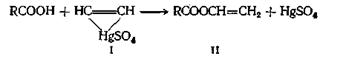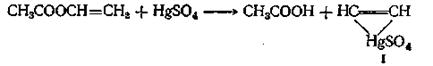«Винильный обмен» требует применения в качестве катализатора ртутной соли сильной кислоты. Температура при этой реакции должна поддерживаться в области 20—80 °С; более высокие температуры приводят к образованию диэфиров этилидена и ангидридов кислот. Этот метод синтеза позволяет получать более чистые мономеры, чем те, которые образуются в результате присоединения ацетилена к кислоте. Считают, что в этом случае соль ртути образует ацетиленовый комплекс (I)